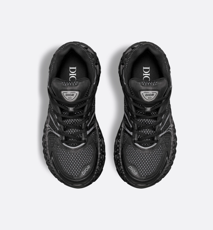 The architectural structure of the hollow sole is decorated with a cannage pattern, which shows the exquisite technical skills of Dior. The loose and lightweight sole provides extraordinary stability and adds vitality to the exquisite silhouette. The black technical fabric upper is cleverly contrasted with the double-layer mesh fabric, which recalls the running shoes of the 1990s. The graphic style has sleek and modern lines, decorated with high-frequency Dior and 47 logos, and the Dior B35 patch on the tongue and heel is a subtle finishing touch. Comfortable and stable, it creates an easy wearing experience.